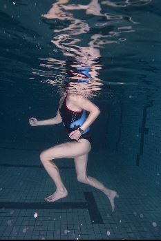 Vi løbetræner og laver øvelser på dybt vand med et aquabælte, som støtter ryg og yder stabilitet i vand.Vandmodstand kræver større muskelkraft, mens tyngdekraft frigøres i vandet, således at dine led kun belastes med 10-25% i forhold til den belastning, de udsættes for på land.